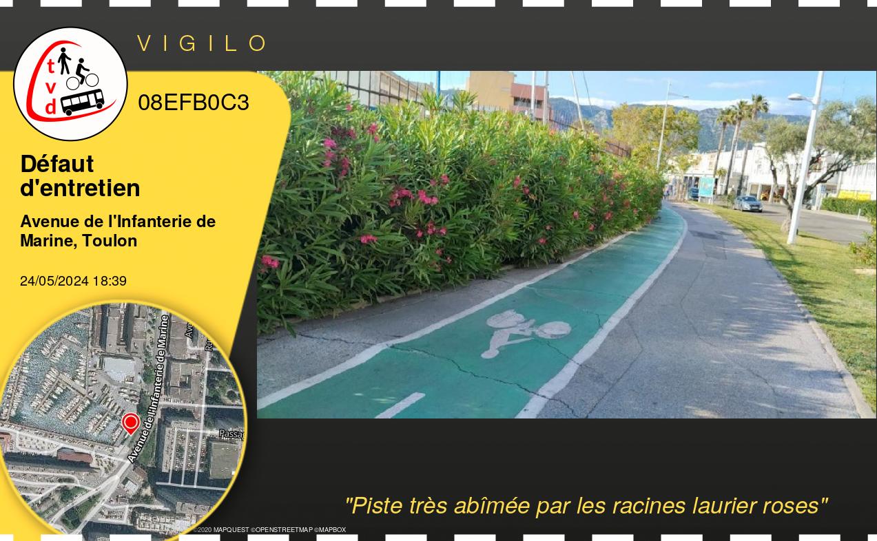 | Avenue de l'Infanterie de Marine, Toulon | Piste très abîmée par les racines laurier roses | Photo - Observations similaires |